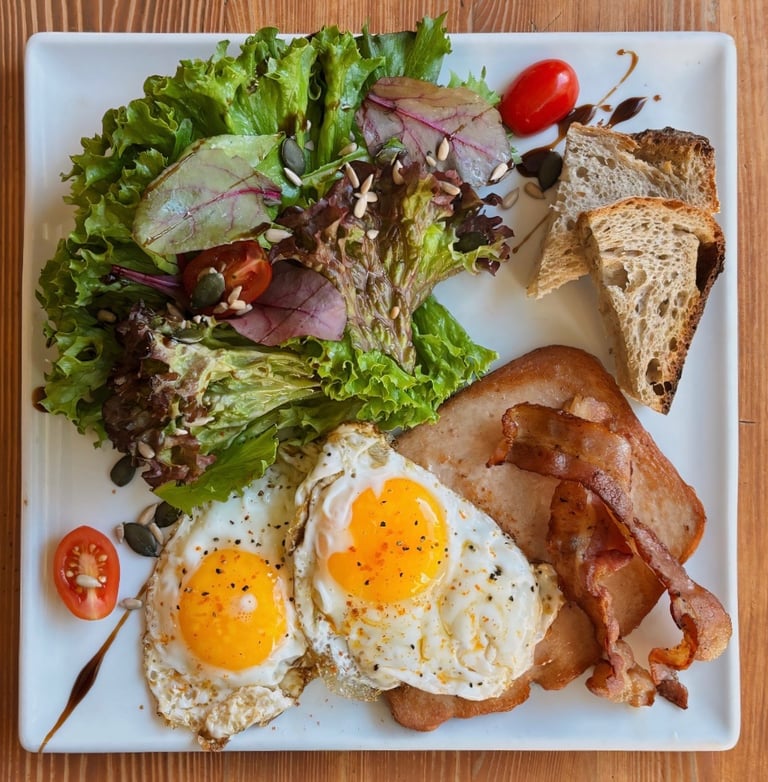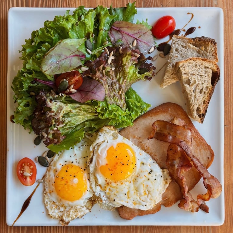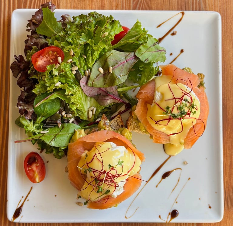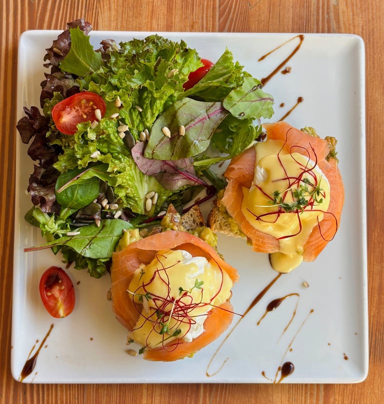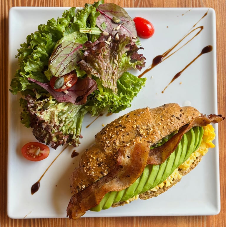 knuspriges Brioche Brot als Sandwich mit hausgemachter pikanter Mayonnaise, cremigem Rührei und Käse; dazu Salat